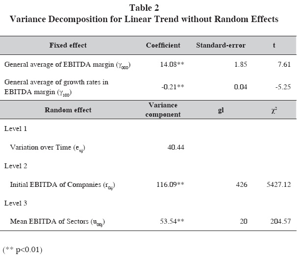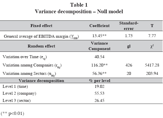 In line with Raudenbush and Bryk (2002) and Fávero and Confortini (2010), through the application of the null model in HLM, table 1 presents the variance decomposition among the levels. As observed, a considerable part of the variance (26.45%) is due to differences among sectors (x2 = 203.94, p<0.01) and a relatively smaller percentage (19.02%) is due to the evolution over time. On the other hand, a significant part of the variability in the EBITDA margin (55.53%) occurred among companies from the same sector (x2 = 5417.28, p<0.01).