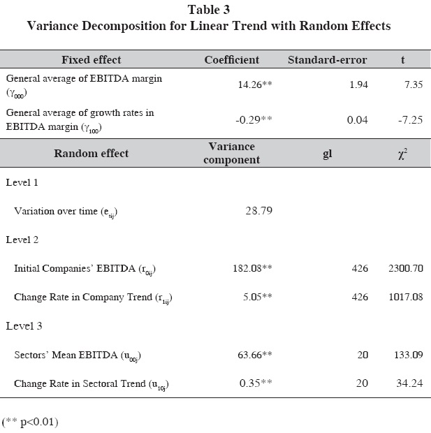 Table 3, which presents the results of the linear trend model with random effects, shows that the variance component for the linear trend is significant (x2 = 1017.08, p<0.01), which indicates significant variance in the EBITDA trend among companies from the same sector over time. Thus, companies from the same sector tend to present significant mutual variations over time. The same is the case for companies from different sectors.