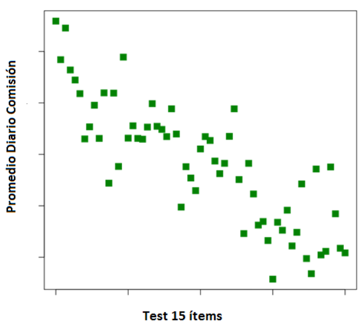 En todos los casos, las correlaciones son significativas (** p < .01), entonces se confirma que el test de 15 ítems tiene validez de constructo y validez de criterio. La Figura 2 muestra la dispersión correlacional entre el puntaje obtenido en el test (eje horizontal) y el promedio de comisión diaria (eje vertical). Cada punto representa a un vendedor o más vendedores, entre más puntaje se tiene en el test, menor es la comisión.