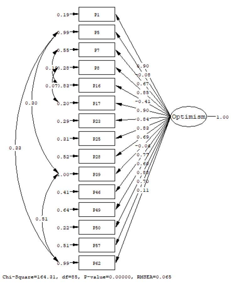 En la Tabla 2 se identificó un factor principal en el que cargan 15 ítems, y las pruebas de Kaiser-Meyer-Olkin de adecuación de muestreo y la de Esfericidad de Bartlett obtuvieron resultados satisfactorios de .964 y 4,252.3 (p = .000); La varianza explicada es del 55.4%; las cargas factoriales de los ítems van de .898 a .318, de acuerdo con el orden presentado en la Tabla 2. Cabe mencionar que cuatro ítems corresponden a estabilidad emocional (EE), tres a locus de control (LC); tres a extraversión (EX), dos a tesón (TE), uno a apertura mental (AM), uno a resiliencia (RE) y uno a automonitoreo (AUM). Se hace notar que 14 ítems van en sentido contrario al factor medido, y sólo el ítem EE2r.16 mide positivamente estabilidad emocional, por lo que este ítem se recodifica a fin de sumarse con los otros 14 ítems y obtener un puntaje total cuya puntuación mínima posible es 15 puntos y el puntaje máximo es de 75 puntos. De acuerdo con la Tabla 3, el puntaje mínimo observado es 15, el máximo observado es 73, la media es 48.1 y la desviación estándar es 15.5. La lectura de los 15 ítems revela que por su interrelación se refieren a un constructo denominado optimismo, que más adelante es explicado.