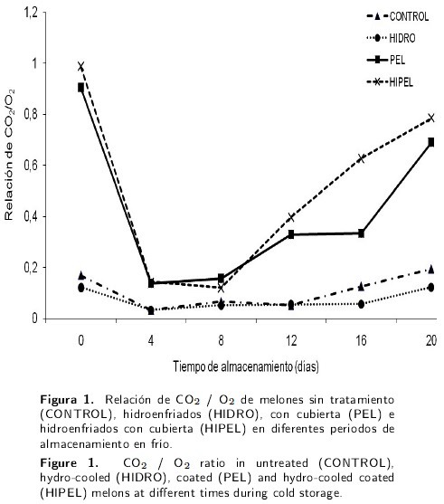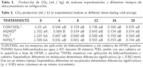 Los datos obtenidos (sin diferencia en la producción de CO2 de los frutos tratados y no tratados) son similares a los de Conforti & Zinck (2002) y Cisneros-Zeballos & Krochta (2003), los cuales reportaron resultados similares al aplicar películas poliméricas en vegetales no climatéricos. Al ser el melón Cantaloupe climatérico se esperaría un comportamiento diferente promovido por una tasa de respiración más elevada (Valero et al. 2002).