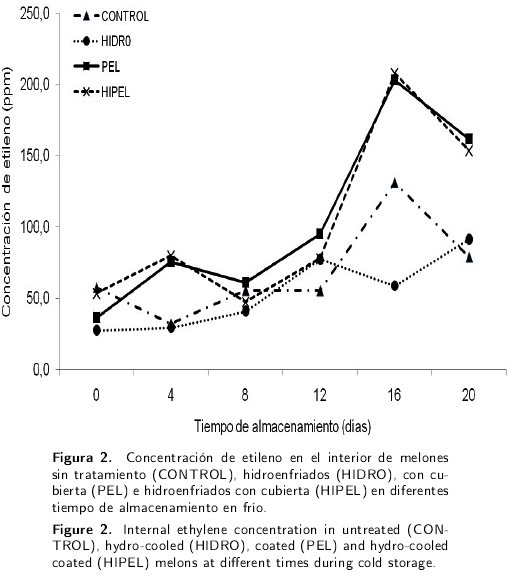En el presente estudio los mL de CO2 generados por los frutos hidroenfriados y con película fueron menores (P < 0.05) únicamente al inicio del experimento, en el que lo melones se encontraban a temperaturas entre 17 y 19 °C (Tabla 1). Una vez que los frutos alcanzaron los 8 °C, generaron cantidades similares de C02 y también de etileno (datos no mostrados). También, se pudo observar que la concentración de los gases internos del fruto (C02, O2 y etileno) tuvo un comportamiento diferente al del CO2 liberado, ya que se evidenció mayor cantidad de CO2 y menores valores de oxígeno (P < 0.05) en los melones cubiertos con la película (PEL E HIPEL) al inicio del experimento y en los días 4, 12, 16 y 20 de almacenamiento (Figura 1); denotando relaciones aproximadas de 1/1 (CO2/O2) en los melones con la película, mientras que en los no cubiertos esta relación fue de aproximadamente 1 / 10, teniendo concentraciones de O2 para llevarse a cabo el metabolismo del fruto en forma normal. Así mismo la concentración de etileno fue mayor en los melones cubiertos llegando alcanzar hasta 200 ppm (Figura 2).