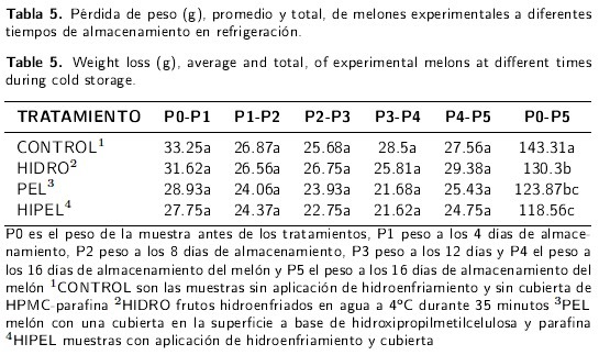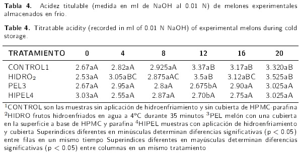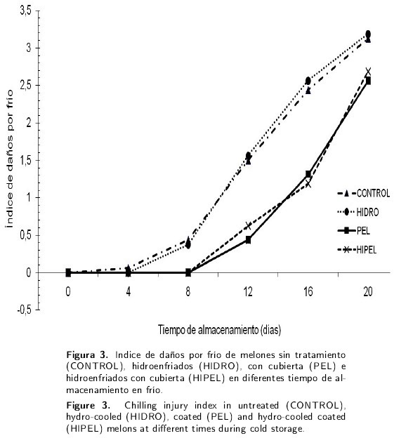 Las diferencias entre los promedio de pérdida de peso, tanto en los frutos cubiertos como en los no cubiertos, fueron relativamente pequeñas, probablemente debido a las altas humedades relativas presentadas en el frigorífico a lo largo del tiempo de almacenamiento (80 ± 4 %). Sin embargo, al colocar estas mismas muestras en condiciones de menor humedad relativa (35-40 %) las pérdidas de humedad en los melones sin cubierta fueron mayores que en los frutos cubiertos (datos no mostrados). Lo anterior es un indicio de que la eficacia de la película se eleva conforme aumenta la diferencia de humedad entre los frutos y el medio ambiente, y que las condiciones de baja humedad relativa conservan las propiedades de barrera de la película (Cisneros-Zeballos & Krochta 2003). Por lo anteriormente escrito, la aplicación de los tratamientos no tuvo un gran impacto en detener el deterioro de la firmeza de los melones en las primeras etapas de almacenamiento en frío. A su vez, el hidroenfriamiento, tal como fue aplicado, no tuvo beneficios sobre la conservación de la calidad del melón; pero el uso de películas a base de HPMC-parafina sobre melón Cantaloupe pudo disminuir la presencia de daños por frío y la pérdida de humedad; así como la conservación de la acidez del fruto durante períodos prolongados de almacenamiento a temperaturas de refrigeración. Por lo que, la aplicación de películas de HPMC-parafina puede ser una buena alternativa para aumentar la vida de anaquel de melón cantaloupe mantenido a temperaturas de refrigeración.