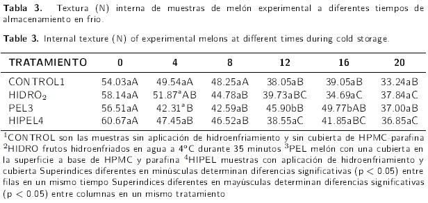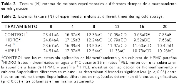 Se evidenció un decremento gradual en la textura de la superficie del melón a lo largo de los 20 días de almacenamiento, en todos los tratamientos analizados (Tabla 2). Sin embargo, la disminución fue menor en los frutos cubiertos con la película (PEL e HIPEL), los cuales presentaron valores mayores de textura (P < 0.05) que las muestras CONTROL e HIDRO.