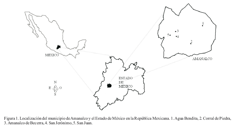 El presente trabajo se llevó a cabo tanto en la cabecera municipal (Amanalco de Becerra) como en cuatro comunidades que se eligieron por ser los sitios de donde provenía la mayor cantidad de hongos comercializados en el tianguis, además de que en tres de ellas se habla el otomí como lengua indígena (Figura 1). Amanalco de Becerra, con una altitud de 2340 m, cuenta con 1044 habitantes, 29 de los cuales hablan lengua indígena, existen 259 viviendas y en promedio habitan cinco personas por casa. En esta comunidad se lleva a cabo el tianguis o día de plaza el cual se coloca cada domingo, está constituido por puestos no fijos y en su interior se da un comercio minorista orientado al abastecimiento de la población del propio lugar y al turismo, ofreciendo artículos de primera necesidad, del giro alimentario y del giro artesanal. Agua Bendita, con una altitud de 2700 m y vegetación con predominio de A. religiosa, cuenta con 596 habitantes quienes no hablan ninguna lengua indígena. Hay 147 viviendas en donde habitan en promedio cuatro personas. Las actividades económicas son la silvicultura, agricultura y ganadería. Corral de Piedra, tiene una altitud de 2941 m y vegetación con predominio de A. religiosa. Cuenta con 246 habitantes donde 13 personas hablan alguna lengua indígena. Existen 54 viviendas donde viven en promedio cinco personas por casa.