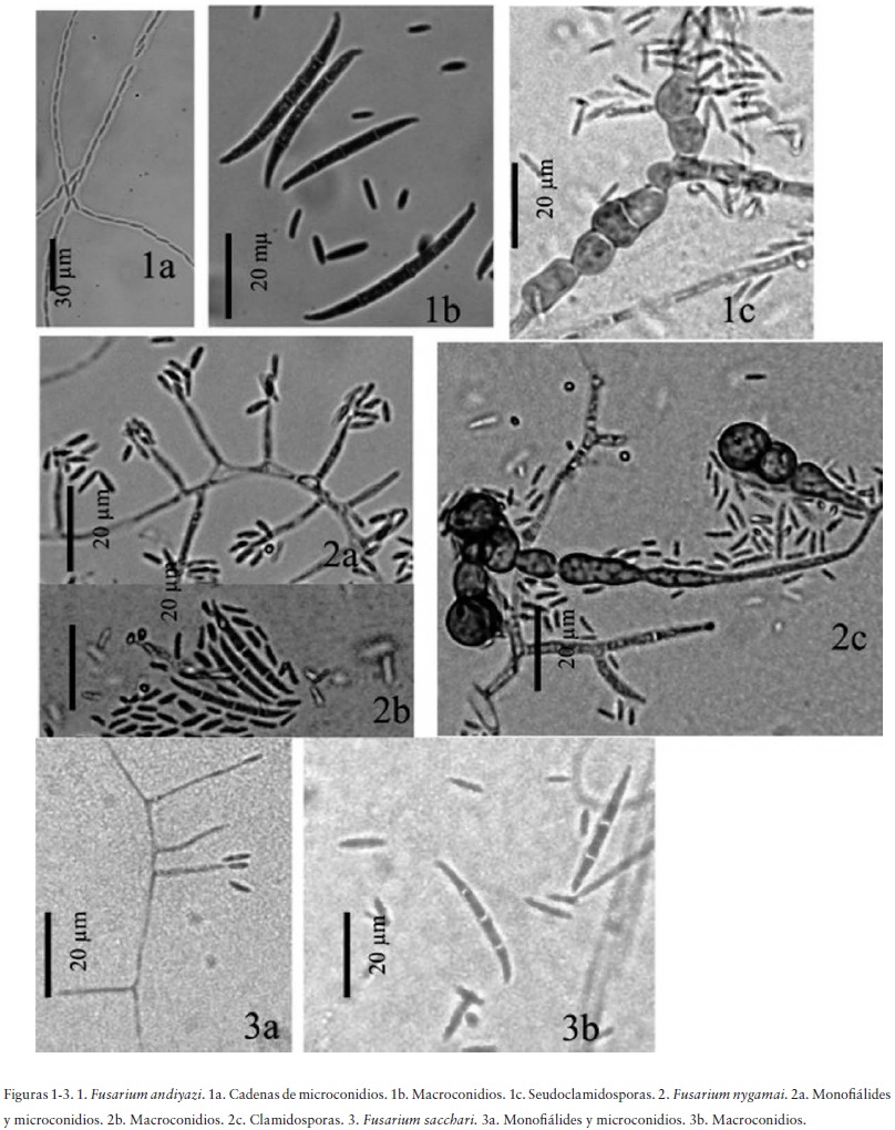 En el presente estudio se obtuvieron un total de 132 aislamientos de Fusarium a partir de las muestras de tejidos necróticos de las raíces de plantas de caña de azúcar analizadas. Estos aislamientos corresponden a ocho especies de Fusarium pertenecientes a cuatro secciones. Las especies identificadas se ubican en las secciones Liseola (F. andiyazi, F. sacchari, F. verticillioides, F. proliferatum, F. nygamai), Martiella (F. solani), Elegans (F. oxysporum) y Gibbosum (F. equiseti). Estas especies se describen a continuación: