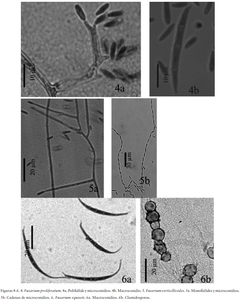 La presencia de las especies de Fusarium encontradas en las raíces de la caña de azúcar coincide con las reportadas en las raíces de otras plantas cultivadas en México. De esta manera en frijol se reportan 10 especies (Montiel-González et al., 2005), coincidiendo en ambas plantas las especies F. oxysporum, F. solani, F. equiseti, F. verticillioides y F. proliferatum. En relación al cultivo del maíz se reportan seis especies (Figueroa-Rivera et al., 2010) coincidiendo las especies F. verticillioides, F. equiseti y F. proliferatum. Mientras tanto en el cultivo del ajo se han reportado cuatro especies (Ochoa-Fuentes et al., 2012), compartiendo a F. verticillioides, F. equiseti y F. solani. En los tres cultivos señalados y en la caña de azúcar se presentan en común las especies F. verticillioides y F. equiseti, causantes de infecciones en las raíces de varias plantas (Leslie y Summerell, 2006).