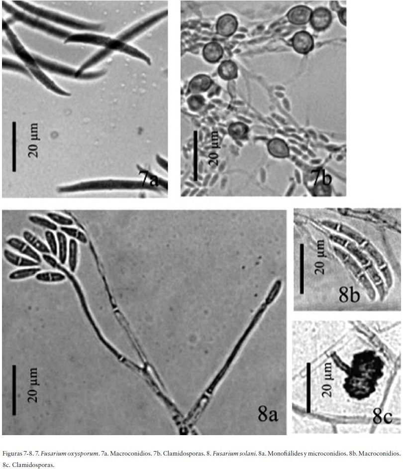 Observaciones. Esta especie se relaciona con F. oxysporum, la cual se caracteriza por las monofiálides considerablemente más cortas, los microconidios ovales y los macroconidios delgados. Esta especie cosmopolita se distribuye en todo tipo de suelos como saprobia (Leslie y Summerell, 2006) y como patógena de plantas se reconocen 18 formas especiales (Booth, 1971) afectando 111 especies de plantas (Bogale et al., 2009) ocasionando ahogamientos, necrosis de la raíz y cancros en los tallos (Holliday, 1980). En México los cultivos más afectados son el frijol, la papa, la calabaza y el chícharo (Romero, 1993). F. solani se ha aislado de caña de azúcar y de otras gramíneas de Malasia pero se considera que no es patógena a estas plantas (Nur-Ain-Izzati et al., 2009).