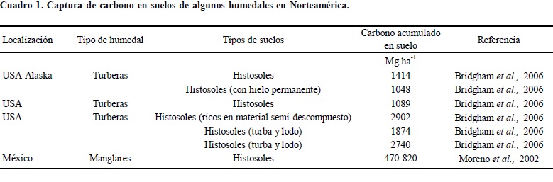 El suelo tiene un papel importante en el ciclo del C en la tierra porque en él se encuentra la principal reserva de este elemento en el planeta. Se ha estimado que el C orgánico en suelos del mundo es de 1500 Pg, cerca de 2.1 veces más que en la atmósfera y cerca de 2.7 veces más que la reserva biótica que comprende a las plantas de la tierra (Neill et al., 1998). En el caso de los suelos de humedales, los promedios de descomposición de material orgánico suelen ser bajos por las condiciones anaerobias, por lo que su potencial de almacenamiento de C es alto (Collins y Kuehl, 2000). La formación de turba en los humedales representa el sumidero de C en estos ecosistemas. La turba se define como suelo sin consolidar formado por materia vegetal fibrosa parcialmente descompuesto que se acumula en un ambiente anegado (Mistch y Gosselink, 2000). La acumulación de turba ocurre cuando la producción primaria en la superficie excede las pérdidas por descomposición y lixiviados, resultando una acreación vertical o lateral de depósitos de material orgánico (Turetsky et al., 2004). En el Cuadro 1 se presentan algunos datos de acumulación de C en suelos de humedales reportados en la literatura. Es importante mencionar que el drenado, desecación de los humedales, estimula la oxidación del C almacenado en ellos con liberación de CO2. Por lo anterior, la conservación de humedales es crítico en la regulación del ciclo del C en la tierra.