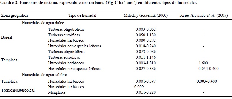 La magnitud de las emisiones de CH4 a la atmósfera por parte de los humedales (Cuadro 2) varía en un amplio intervalo, ya que como se ha mencionado, la producción de este gas es influenciado por varios factores. La emisión de CH4 ha sido más estudiada en turberas de las zonas boreales y en los humedales de agua dulce de las zonas templadas y menos estudiado en humedales con especies leñosas, los pastos salados, los humedales herbáceos y los manglares de zonas tropicales (Bergman et al., 2000; Mitsch y Gosselink, 2000). Es importante mencionar que en México el estudio de los humedales se ha centrado más en los humedales costeros de agua salobre como los manglares (López-Portillo y Ezcurra, 2002; Moreno et al., 2002; Moreno-Casasola et al., 2002) y más recientemente se han estudiado humedales herbáceos de agua dulce y la selva inundable (López-Rosas et al., 2005; 2006). Estos estudios se han enfocado a la descripción florística, vegetal, edafológica e hidrológica, así como, a planes de manejo, restauración y conservación de este tipo de humedales. Sin embargo, aún no se han realizados estudios detallados sobre los procesos biogeoquímicos y el intercambio de gases en los humedales mexicanos que ayuden a entender el papel de estos ecosistemas como captadores de C o emisores de gases efecto invernadero. Bridgham et al. (2006), describieron que existe una gran incertidumbre al realizar el balance de C en los humedales de Norteamérica, debido a la falta de datos de campo sobre la captura de C y emisión de gases en los humedales de México.