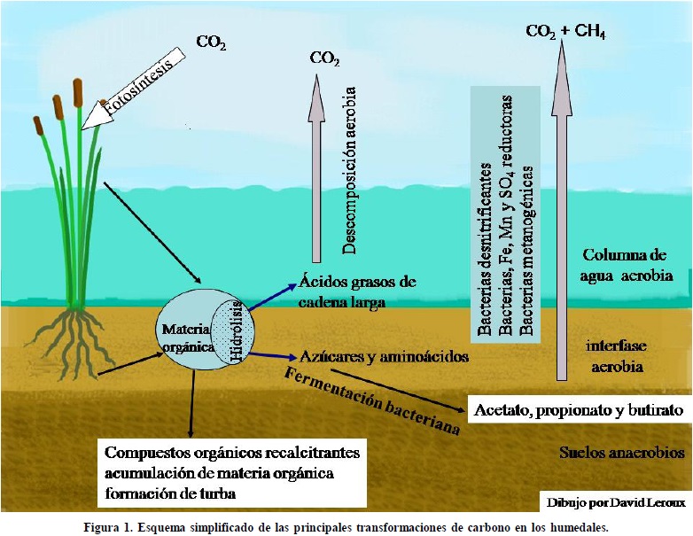 En los humedales existen gradientes de oxido-reducción, que influencian fuertemente el destino y las trasformaciones de la materia orgánica (Figura 1). En la columna de agua imperan condiciones aerobias al igual que en los primeros milímetros del sedimento. Sin embargo, después de aproximadamente 15 cm de profundidad, la densidad de las raíces disminuye y empiezan a imperar condiciones anaerobias en los sedimentos (Collins y Kuehl, 2000). El carbono captado por la fotosíntesis y convertido a C orgánico llega al sedimento cuando ocurre senescencia en las plantas. Inicialmente, se lleva a cabo la hidrólisis de compuestos de cadena larga como los lípidos, las proteínas y los carbohidratos presentes en el material vegetal. Posteriormente, dependiendo de las condiciones de oxido-reducción, los productos de la hidrólisis pueden seguir diferentes rutas metabólicas. Si se encuentran en zonas aerobias, ellos pueden ser oxidados a CO2 y H2O utilizando el oxígeno como último aceptor de electrones. Por otro lado, si los compuestos orgánicos se encuentran en zonas anaerobias, los microorganismos utilizan la glucosa para obtener energía química produciendo ácidos orgánicos de bajo peso molecular como el acetato, propionato y butirato, los cuales serán convertidos a CO2, utilizando aceptores de electrones como NO3-, Mn4+, Fe3+ y SO42-. En la desnitrificación se usan nitratos como aceptores de electrones para la oxidación de la materia orgánica cuando el potencial redox es de 450 mV. Cuando el nitrato se agota, ocurre la reducción de Mn+4 a 400 mV, seguido por la reducción de Fe3+ a 180 mV. Esas reacciones son llevadas a cabo por bacterias que usan la fermentación para la obtención de energía. Los anaerobios obligados reducen el sulfato cuando el potencial redox baja a -215 mV y el CH4 se empieza a producir en cuanto el potencial redox es menor a -244 mV (Neue et al., 1997; Mitsch y Gosselink, 2000).
