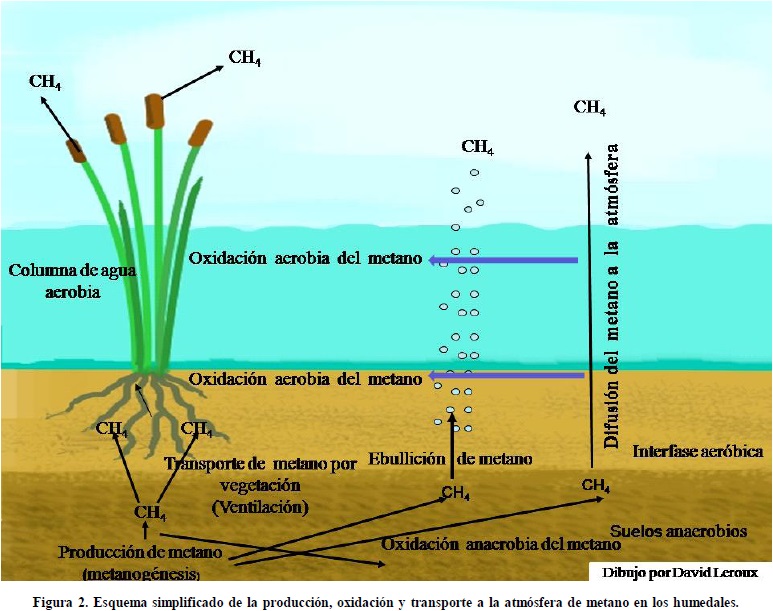La emisión de metano a la atmósfera en los humedales, no sólo depende de su producción (metanogénesis), sino también de su consumo u oxidación y de su transporte del sedimento a la atmósfera (Christensen et al., 2003; Tauchnitz et al., 2007; Zhu et al., 2007). La producción de CH4 se obtiene bajo condiciones extremadamente reducidas (-224 mV), por diversos géneros de bacterias, que, dependiendo del sustrato que utilizan, se pueden dividir en los siguientes grupos fisiológicos (Torres-Alvarado et al., 2005):