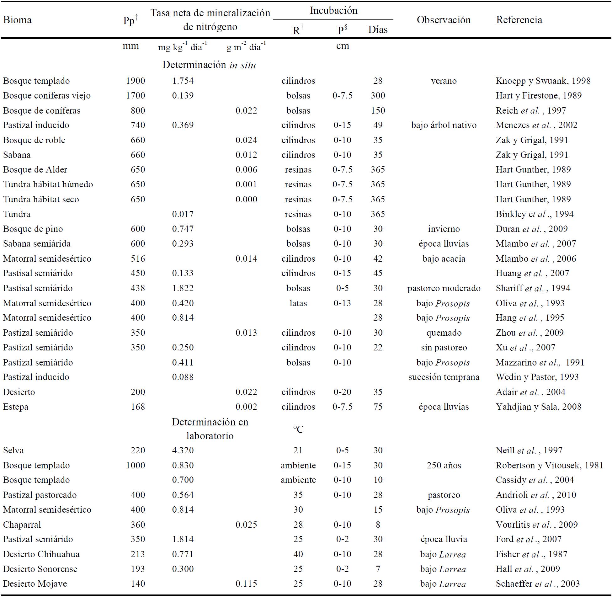 Los valores máximos de tasa de mineralización mostrada en el Cuadro 1, tanto in situ como potencial se presentan en los lugares con mayor precipitación, mientras que en regiones áridas y semiáridas los resultados máximos fueron obtenidos en el suelo bajo el dosel de arbustos o árboles (principalmente de la familia de las leguminosas); otro elemento importante es el periodo de análisis de la mineralización, en algunos casos se restringe al periodo con mayor actividad microbiana; por lo que la comparación entre biomas debe de considerar la heterogeneidad espacial y temporal de las zonas áridas y semiáridas.