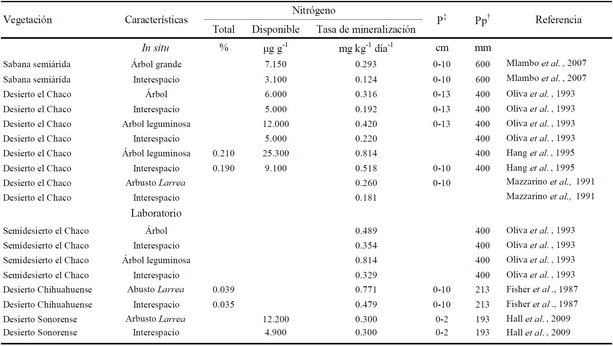 En la mayoría de los trabajos reportados en el Cuadro 2, además de mostrar mayor tasa de mineralización bajo árboles ó arbustos, también presentan valores mayores de nitrógeno disponible (la suma de amonio más nitrato) y nitrógeno total. Algunos estudios incluso, han encontrado mayor nitrógeno disponible bajo el dosel de Larrea (Hall et al., 2009) aunque la tasa de mineralización potencial para Larrea e interespacio fue similar. Tanto los datos de evaluaciones in situ como potenciales mostraron las mismas tendencias. Lo anterior confirma la importancia determinante de la especie o tipo funcional presente, en el aporte de nitrógeno al suelo y mineralización de nitrógeno en los ecosistemas de zonas áridas y semiáridas. Aún los interespacios cercanos a una leguminosa mostraron más nitrógeno en el suelo que los interespacios cercanos a árboles no leguminosas (Oliva et al., 1993). Una misma tendencia se ha encontrado previo a la lluvia y posterior a ella (Hang et al., 1995).