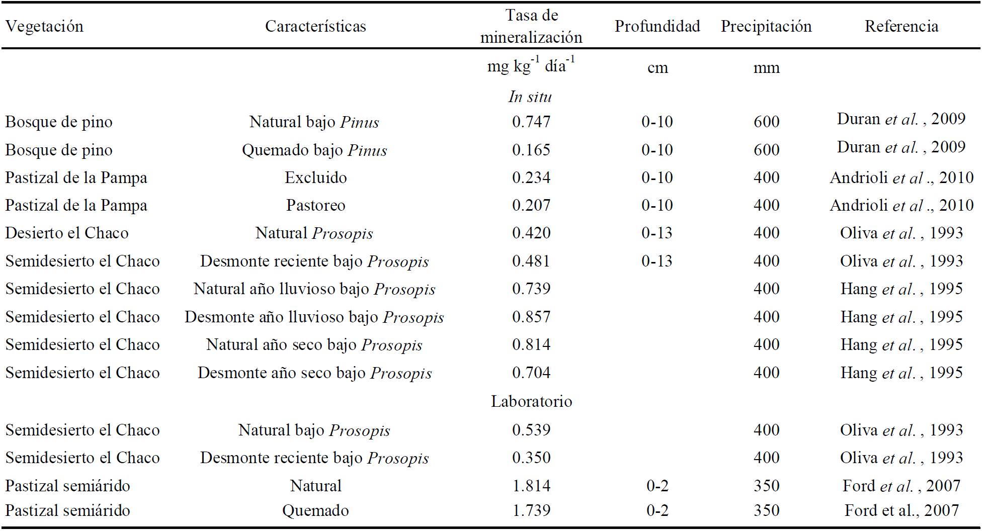 Perturbación de la cubierta vegetal. En el Cuadro 3 se muestra la tasa neta de mineralización en vegetación natural y perturbada de zonas áridas y semiáridas de varios autores. En forma general la vegetación natural presenta mayores tasas de mineralización neta de nitrógeno, con las excepciones de trabajos donde la perturbación era reciente y quizás el efecto sobre los procesos de mineralización aún no se mostraba (Oliva et al., 1993), y donde el área desmontada presentaba mayor tasa de mineralización en un año lluvioso (Hang et al., 1995), sin embargo en un año con lluvias por debajo del promedio la vegetación natural presentó mayor tasa de mineralización.