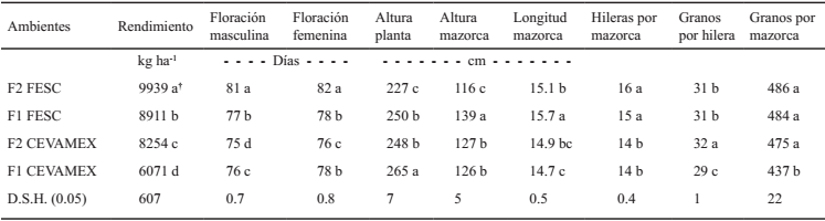 En la comparación de medias para rendimiento entre ambientes, hubo cuatro grupos de significancia (Cuadro 1), los promedios del rendimiento de los ambientes fueron diferentes entre sí. El rendimiento mayor (9939 kg ha-1) se obtuvo en los terrenos de la FESC-UNAM campus Cuautitlán en la segunda fecha de siembra (primera quincena de mayo). La segunda fecha de siembra presentó rendimientos mayores con respecto a la primera en las dos localidades, lo cual se debe al estrés en las plantas por falta de humedad (sequía) en la primera fecha de siembra, lo cual no ocurrió en los experimentos sembrados en la segunda fecha, coincidiendo estos resultados con los reportados por Tadeo-Robledo et al. (2014).