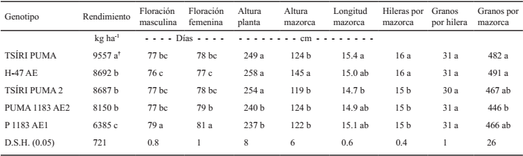La comparación de medias entre los híbridos evaluados indicó que el rendimiento más alto correspondió a Tsíri PUMA, con 9557 kg ha-1, diferente estadísticamente al de los híbridos H-47 AE y Tsíri PUMA 2, que rindieron 8692 kg ha-1 y 8687 kg ha‑1, respectivamente (Cuadro 2). Lo anterior indica que la conformación genética por el origen de los progenitores y los híbridos poseen productividad diferente. El híbrido Tsíri PUMA se desarrolló en el programa de mejoramiento genético de la FESC-UNAM y recientemente fue inscrito en el Catálogo Nacional de Variedades Vegetales (CNVV), con el número de registro MAZ-1571-290514 (Tadeo-Robledo et al., 2014). Este híbrido es resultado de trabajos con el esquema de androesterilidad que se realiza desde 1992 con investigadores de la UNAM campus Cuautitlán, (Tadeo-Robledo et al., 2010; Tadeo-Robledo et al., 2014).