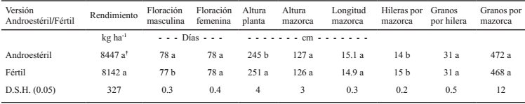 La comparación de medias entre versiones, para las demás variables evaluadas, indicó que no hubo diferencias significativas para floración femenina, altura de mazorca, longitud de mazorca, granos por hilera y granos por mazorca; este resultado se atribuye a que las versiones son isogénicas, es decir, son genéticamente similares, excepto para los genes génico-citoplásmicos relacionados con la esterilidad masculina tipo C, que causan que en la versión androestéril no haya producción de polen, mientras que en la fértil sí (Tadeo-Robledo et al., 2007; Tadeo-Robledo et al., 2010; Tadeo-Robledo et al., 2012; Tadeo-Robledo et al., 2013). Por otro lado, en otras variables como floración masculina, altura de planta e hileras por mazorca, aún cuando hubo diferencias, estas no fueron suficientes para afectar de manera significativa el rendimiento entre las versiones.