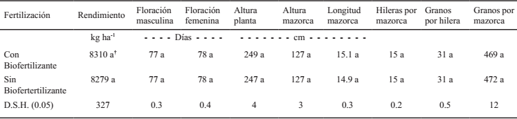Los resultados de este trabajo para los tratamientos con y sin biofertilizante también contrastan con los de Grageda-Cabrera et al. (2012), quien reportó rendimientos de maíz de 10 069 kg ha-1 en parcelas biofertilizadas con micorriza, y de 9336 kg ha-1 en el tratamiento testigo, lo que significó una diferencia del 8%. Por su parte González-Camarillo et al. (2012), en dos parcelas de validación con el híbrido de maíz H-565 y la dosis de fertilización de 90-60-00 aplicada al testigo y a parcelas tratadas con micorriza INIFAP, reportó un rendimiento promedio de 6900 kg ha-1 para el testigo y de 7700 kg ha-1 para el tratamiento con micorriza; esta diferencia representa 11% más de rendimiento utilizando micorriza INIFAP. Estos resultados indican la conveniencia de verificar en ciclos siguientes los resultados de los maíces androestériles y fértiles, con un manejo de fechas de siembra diferentes donde pudiera expresarse el efecto de Glomus intraradices, pero sobre todo para tener mayor información de la respuesta a este biofertilizante del INIFAP.