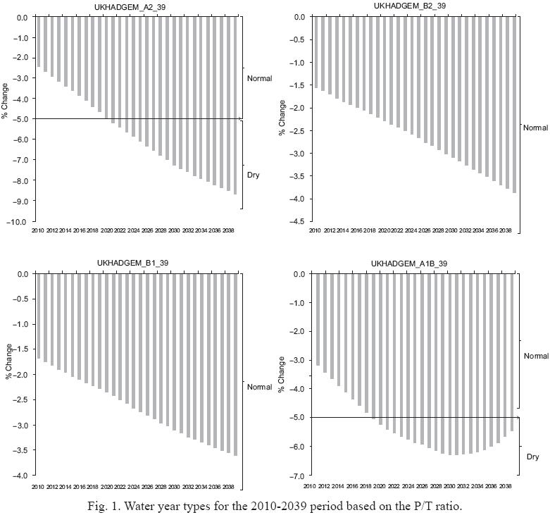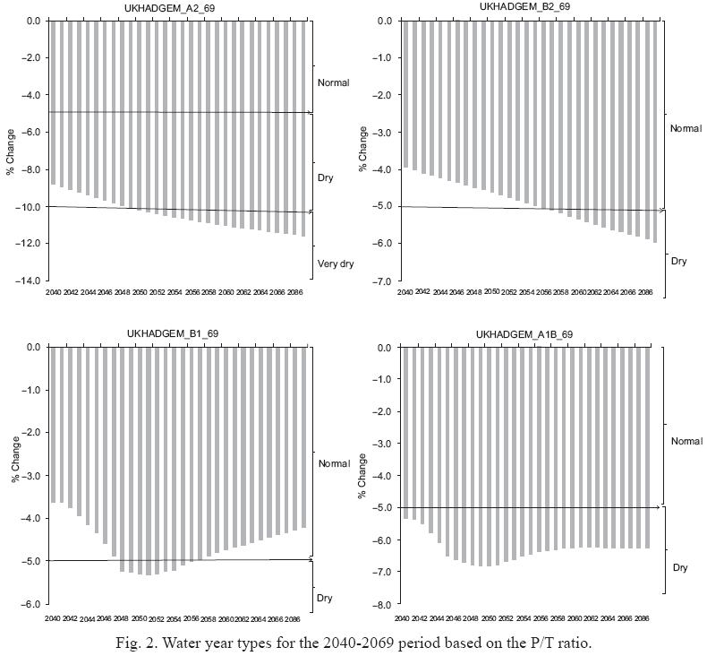 As for the types of water years estimated by means of the P/T relationship, the analysis found that none of the cases presents changes that favor the water supply; on the contrary, there is a definite tendency towards decrease in the supply. Figure 1 shows that, although the B2 and B1 scenarios would be the only ones to fall within the normal range, over time they would get closer to states of ever increasing dryness. The A2 and A1B scenarios would stay within the average range until approximately 2020, but then they would start getting dry –a condition that would be more intense for the 2040–2069 period, as shown in Figure 2.