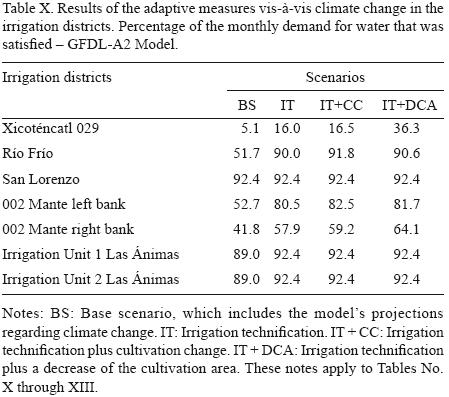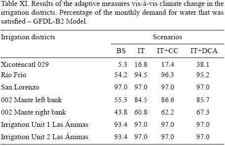 Table X presents the results in the irrigation districts in terms of the percentage of the demand for water which was satisfied under the conditions of climate change created by the GFDL–A2 model. There is a noticeable improvement in the coverage, particularly in the Xicoténcatl 029, Río Frío, and Mante irrigation districts; nevertheless, it is equally clear that these percentages do not go beyond 90% –as is the case in the San Lorenzo and Las Ánimas irrigation districts. This confirms the conclusion that CNA will have to reconsider the policy of water concessions to the agricultural sector in these irrigation districts in order to adjust them to the results which were obtained through the modeling process.