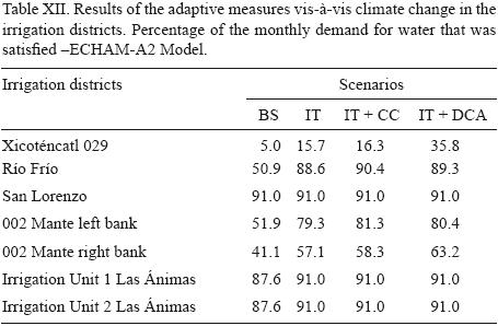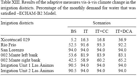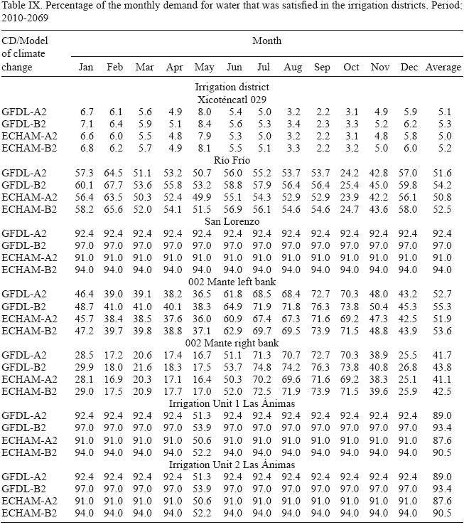 Finally, it is evident that the highest percentages of the demand coverage in the irrigation districts of this basin are achieved under the climate change conditions yielded by the GFDL–B2 model (see Table XI); in other words, the climatic profile that this model contributes is the least adverse to the satisfaction of the demand for water in the region. On the other hand, the least favorable conditions to meet the requirements of the agricultural sector in the region were obtained by the ECHAM–A2 model (see Table XII).