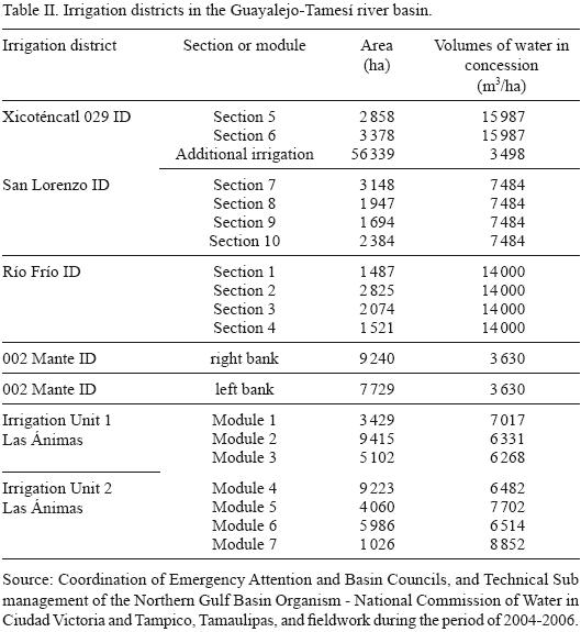 Another important conclusion can be drawn from the case of the Xicoténcatl irrigation district, which has an additional irrigation area of 56 339 ha. The volumes of water that are available in the Guayalejo River –within the basin in question – are not sufficient to irrigate this area. As can be seen in Table X, once this additional area of irrigation is reduced, the coverage percentage goes from 16 to 36.3%. In the case of the Xicoténcatl irrigation district, the distribution of water in concession needs to be updated in order to match the hydrological reality of that region.