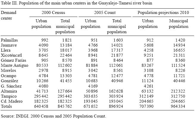 Table III presents the information on demand centers and population that was incorporated into the WEAP model. These figures were based on the results of the 2000 Census and the 2005 population count which were carried out by INEGI, as well as on the their population projections for these cities and the municipalities for 2010. The total municipal population is the sum of the urban and rural inhabitants. Since the municipalities of Tampico and Ciudad Madero are completely urbanized, the figures for these two cities represent the total population. The projected population for 2010 is 707 390 inhabitants in the main urban centers and 964 334 in the municipalities.