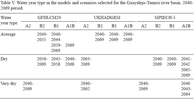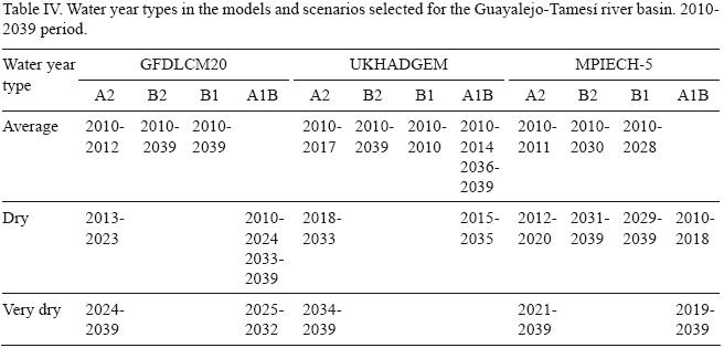 The P/T ratio was obtained by running the MAGICC/ScenGen1 program (Version 5.3) for the MPIECH–5, GFDL2.0, UKHADCM3 models. Considering the A2, B2, B1, and A1B scenarios of greenhouse gas emissions, rainfall anomalies in the basin during the periods of 2010–2039 and 2040–2069 were estimated in order to establish the water year type (Very wet, Wet, Average, Dry or Very dry), which was entered as input data for the WEAP modeling runs. The anomalies found were interpolated at the location of the Magiscatzin weather and hydrometric station; from this point, the climate baseline for the period of 1960–1990 was generated. Tables IV and V show these results. Based on the results of the MAGICC/Scen–Gen runs, it is evident that no Wet or Very wet years are expected in the Guayalejo–Tamesí river basin for the 2010–2069 period.