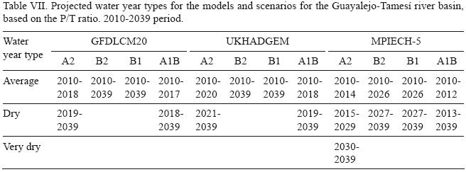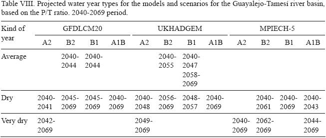 Tables VII and VIII show the projections of water year types for the Guayalejo–Tamesí river basin for the periods of 2010–2039 and 2040–2069, respectively, taking into account the P/T ratio and the aforementioned criteria.