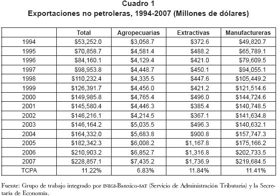 La estrategia de crecimiento basado en las exportaciones manufactureras iniciada desde finales de la década de los ochenta, se profundizó con el establecimiento del TLCAN firmado por Canadá, Estados Unidos y México. Lo anterior resultó en un rápido crecimiento de las exportaciones no petroleras, particularmente de las exportaciones manufactureras y maquiladoras (cuadro 1). Este patrón de crecimiento económico de México tuvo como efecto dinamizar la economía de la frontera, aunque la expansión maquiladora no ha logrado generar cadenas productivas sólidas que expandan el mercado interno debido a que la meta principal de la producción del sector se ha orientado, casi totalmente, al mercado de Estados Unidos. No obstante, el crecimiento experimentado en la región estimuló la creación del empleo en la industria maquiladora y las actividades exportadoras.