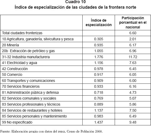 En el caso de la frontera norte, se aprecia que, en promedio, la población de las ciudades fronterizas se concentra en trabajos del sector manufacturero. De acuerdo con los índices de localización construidos para las ciudades de la frontera,15 en promedio las ciudades localizadas en la frontera norte mostraron un índice de especialización de 1.78 en el sector manufacturero, seguido del sector de electricidad y agua y el de servicios de restaurantes y hoteles con 1.16 y 1.14 respectivamente (cuadro 10).