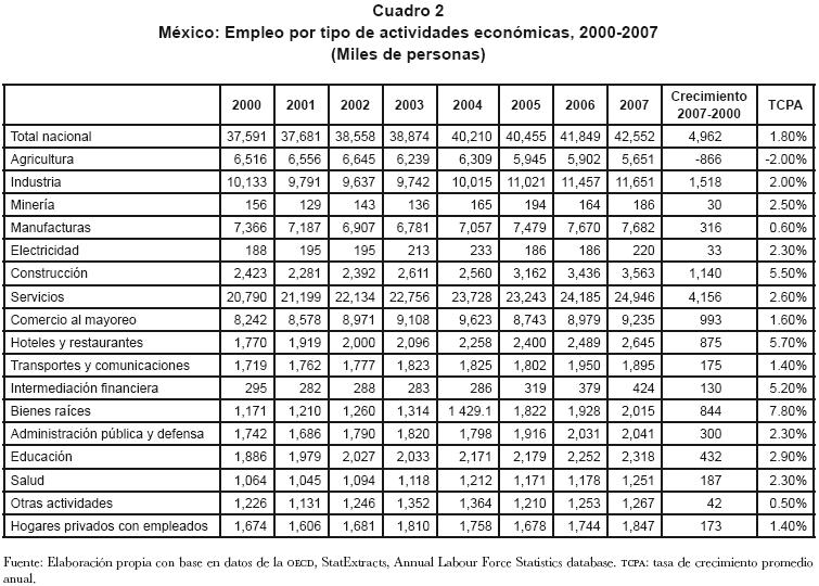 Así, a partir del año 2001 se aprecia que el comportamiento del empleo en la economía mexicana mostró una reducción del ritmo de crecimiento el cual cayó a una tasa del 0.2% pasando de 37.59 millones de personas a 37.68 millones (cuadro 2). En particular, se observan caídas importantes en el sector industria en su conjunto, las manufacturas, la minería y el sector de la construcción. A partir de ese año, la dinámica del empleo total en México muestra un estancamiento relativo, alcanzando una tasa de crecimiento promedio anual de 1.8% entre el 2000 y el 2007. Además, se aprecia una franca declinación del empleo en el sector agrícola de 2% y un crecimiento muy lento del empleo en el sector de las manufacturas.