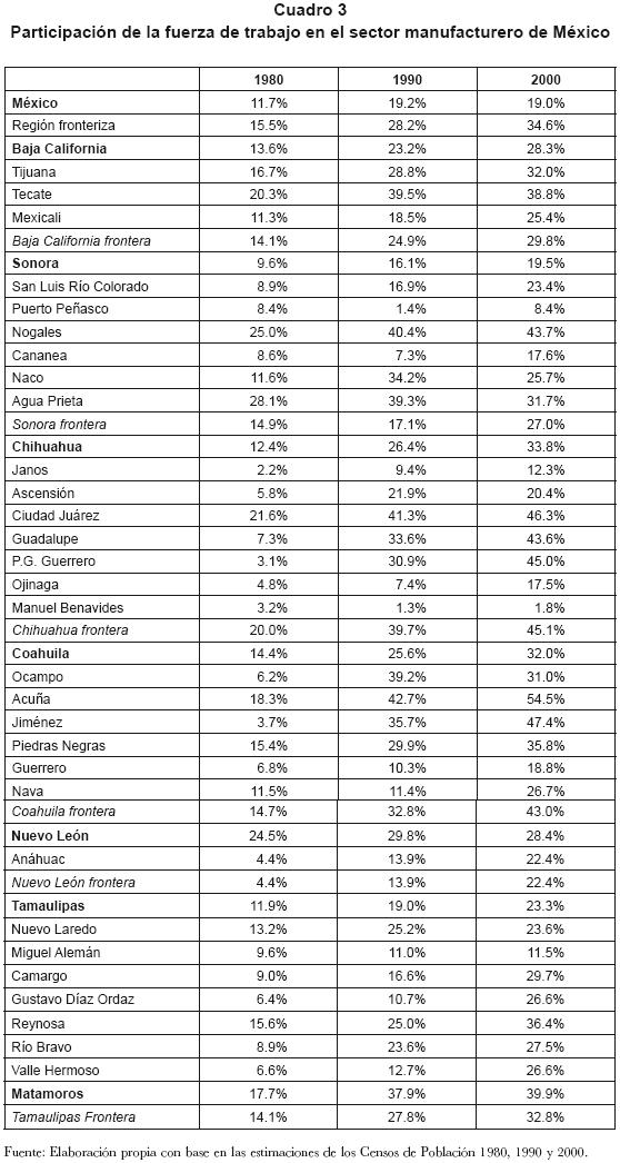 De esta manera, una característica del empleo en la frontera norte se refiere a su dinamismo en el sector manufacturero. Con base en los Censos de Población de 1980, 1990 y 2000, se aprecia que la participación de la fuerza de trabajo en el sector manufacturero en el ámbito nacional se elevó de 11.7% en 1980 hasta 19% en el 2000. No obstante, la región fronteriza de México (compuesta por ciudades que se encuentran en la línea fronteriza o a menos de 200 kilómetros) mostró un mayor dinamismo, pasando de 15.5% a 34.6% del total del empleo en la región en el mismo periodo (cuadro 3).