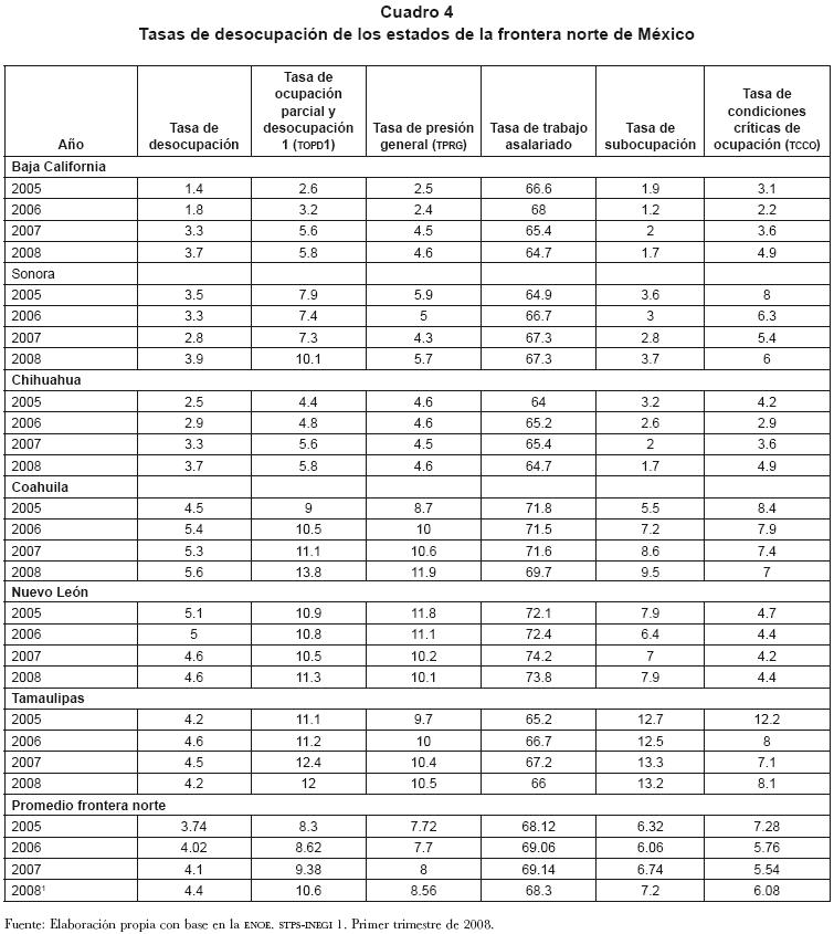 Una segunda característica a destacar es que las tasas de desempleo abierto de los estados de la frontera norte de México son menores a las experimentadas en otras regiones del país. Así, la tasa de desempleo abierto de la región frontera norte alcanzó 3.7% en 2005 y se incrementó a 4.4% en 2008. No obstante, la presión ejercida por el incremento de la PEA se refleja de manera más directa por la tasa de desocupación parcial y desocupación5 que incluye no sólo la desocupación sino también la subocupación que se experimenta por trabajadores que no pueden ocuparse en empleos de tiempo completo. Dicha tasa fue superior a la tasa de desempleo abierto, alcanzando 8.3% en 2005 y 10.6% en el primer trimestre de 2008. Asimismo, la tasa de condiciones críticas de ocupación alcanzó 7.3% y 6.1% en el periodo referido,6 demostrando la creciente problemática de desempleo que se experimenta en la región (cuadro 4).