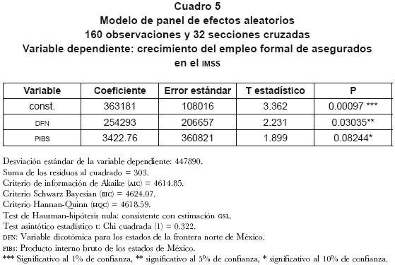 Los resultados que se presentan en el cuadro 5 muestran que los coeficientes de las variables explicatorias fueron positivos y estadísticamente significativos. Lo anterior sugiere que el crecimiento de la actividad económica ha sido un determinante regional del crecimiento del empleo de los trabajadores registrados en el Seguro Social. No obstante, el resultado más importante es que el coeficiente de la variable dicotómica que representa el efecto del PIB de los estados de la frontera norte en el crecimiento regional ha mostrado un impacto superior al del total de los estados de la economía mexicana. Lo anterior permite suponer que la dinámica económica de los estados de la frontera norte, cuya especialización se ha centrado en el desarrollo de actividades de exportación, fundamentalmente orientadas a la exportación, ha tenido un efecto decisivo en el crecimiento de la región.