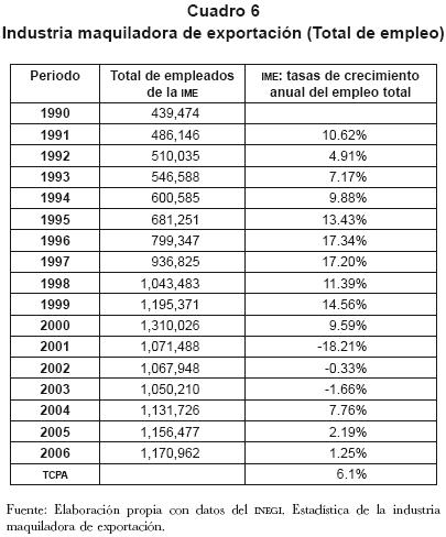En todo caso, la industria maquiladora de exportación (IME) se caracterizó por un explosivo crecimiento del empleo, particularmente entre 1990 y 2000, cuando experimentó una tasa de crecimiento promedio anual de 10.9%. En particular, los años de 1995, 1996 y 1997 presentaron tasas de crecimiento anual de 13.4%, 17.3% y 17.2% respectivamente (cuadro 6). No obstante, este sector, que se había convertido en el motor del crecimiento en la frontera norte, sostuvo una drástica caída del empleo en 2001 (18.2%), recuperándose en 2004 (7.8%), para mantenerse estancado desde entonces.