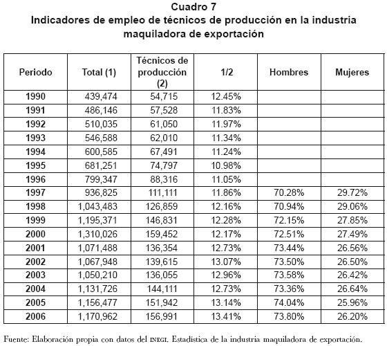 Cabe destacar que si bien la IME generó un impulso significativo del empleo manufacturero en la frontera norte de México, por lo menos hasta el año de 2001, no se observó que este tipo de industria se desarrollara hacia procesos productivos que incidieran significativamente en la elevación de la calificación de la fuerza de trabajo en esta actividad económica. Así, entre 2000 y 2006 la participación porcentual de técnicos de producción en el total de trabajadores empleados en la IME se elevó de solamente 12.5% en el primer año a 13.4% 16 años después (cuadro 7).