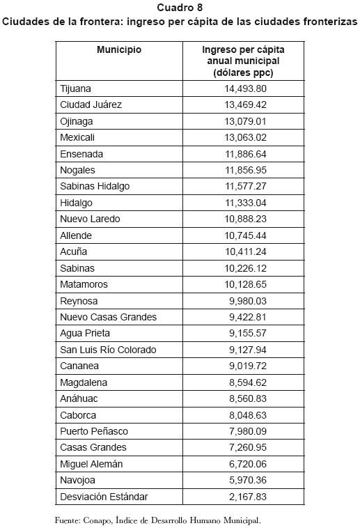 El impacto del crecimiento económico y de la población ha tenido implicaciones para la economía mexicana en lo relativo a los niveles de ingreso per cápita, los mercados de trabajo y la localización de la actividad económica. En lo que toca al ingreso per cápita, los más elevados de las ciudades fronterizas se localizan en Tijuana, Ciudad Juárez y Ojinaga, con niveles estimados de 14.493, 13.469 y 13.079 dólares, respectivamente. El promedio de ingreso para las ciudades fronterizas era de 8.609 dólares con una desviación estándar de 2.167 dólares, siendo el promedio a nivel nacional de 7.495 dólares (cuadro 8).