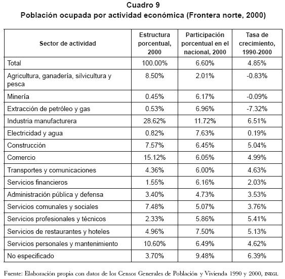 El total de la población ocupada en las ciudades fronterizas del norte más importantes representaba 6.6% del total del empleo del país, y su tasa de crecimiento promedio anual entre 1990 y 2000 fue de 4.9%. Asimismo resalta la importancia que tienen las actividades manufactureras en este tipo de ciudades, con 11.7% del total del empleo nacional en 2000. También se aprecia que este tipo de empleo ha crecido significativamente en estas ciudades, con una tasa promedio anual de 6.5%. Otras actividades económicas de importancia, dado su peso en el empleo ocupado, son servicios de restaurantes y hoteles, electricidad y agua, construcción, extracción de petróleo y servicios personales y el comercio (cuadro 9).