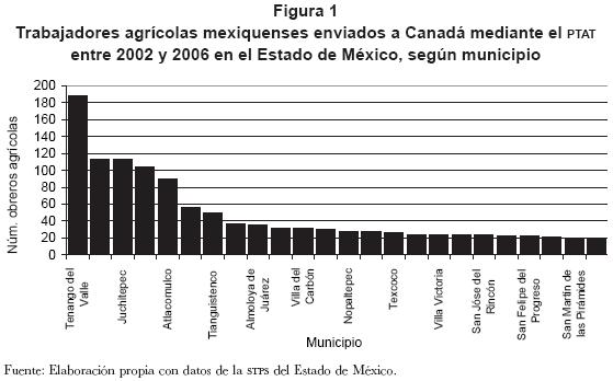 Cabe señalar que existe una triple competencia entre diferentes agentes colectivos interesados en enviar más jornaleros a laborar fuera de su lugar de origen. Un primer nivel se sitúa entre los países del "Sur" que han firmado un convenio con el gobierno canadiense y la poderosa organización patronal FARMERS , quienes han perfeccionado tácticas de negociación para disminuir los costos y prestaciones para contratar a trabajadores del "Sur", agudizando la competencia entre los países participantes en el programa (Binford, 2006; Vanegas, 2003). Un segundo nivel de competencia es entre las diferentes entidades federativas de un mismo país. Según la responsable del PTAT en el Estado de México, el número de obreros agrícolas que se atribuye cada año a los estados es una decisión unilateral que se toma en las oficinas centrales de la STPS.9 Empero, las estadísticas tienden a mostrar que hasta el momento se ha privilegiado el reclutamiento de jornaleros agrícolas en las regiones circunvecinas al Distrito Federal (Morelos, Tlaxcala, Puebla, Hidalgo, Querétaro y el Estado de México), aunque desde algunos años se han incorporado paulatinamente campesinos provenientes de otras entidades federativas como Oaxaca y Veracruz. Un tercer nivel donde se ejerce una competencia para enviar trabajadores a Canadá se da entre los municipios de una misma entidad federativa. En el caso del Estado de México, por ejemplo, entre 2002 y 2006 únicamente 93 de los 125 municipios han tenido algún obrero agrícola efectivamente enviado a Canadá mediante el PTAT, y de estos 93 municipios 20 concentran 71.15% del total de salidas (figura 1).