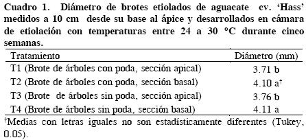 En el diámetro de los brotes etiolados (Cuadro 1) hubo diferencias significativas (P < 0.05), ya que el material obtenido de secciones basales originó los brotes de mayor diámetro, sin importar si el árbol había sido podado o no. Al estudiar la propagación de plantas leñosas por estaquillado, Hartmann et al. (1996) reportaron que hay diferencias en la composición química a lo largo de una estaca, y que la capacidad de enraizamiento de las porciones basales es mayor que las provenientes de partes apicales, lo cual podría estar relacionado con diferencias en la acumulación de carbohidratos. Los mismos autores destacaron que en análisis químicos realizados en ramas de rosal (Rosa spp.), las secciones basales fueron las que presentaron mejor equilibrio en el cociente carbono/nitrógeno, que fue cercano a uno.