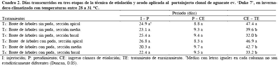 El material vegetal de los Tratamientos 1 y 4, que corresponden a brotes sin y con poda, provenientes de la sección apical de arboles, respectivamente, demoraron más tiempo en lograr la altura necesaria (30 cm) para iniciar el proceso de enraizamiento (Cuadro 2). Sin embargo, ninguno de los seis tratamientos tuvieron efecto significativo en las dos etapas anteriores del proceso de clonación, lo que se contrapone a lo planteado por McKenzie et al. (1988) y Whiley et al. (2007), quienes destacaron la importancia de utilizar árboles podados para la obtención de material vegetal adecuado para la propagación. Una posible explicación de tal contraste podría ser el hecho de que los árboles utilizados en este ensayo eran jóvenes, 4 años los no podados y de 3 años los podados.