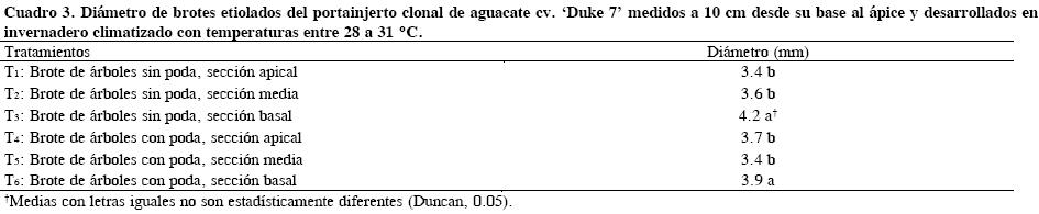 El diámetro de los brotes etiolados del portainjerto clonal 'Duke 7' mostró que los Tratamientos 3 y 6, ambos con brotes basales, superaron (P ≤ 0.05) a los demás tratamientos (Cuadro 3), lo que destaca nuevamente la importancia de la posición de la yema dentro del brote en el desarrollo vigoroso de éstos. Estos resultados concuerdan con los obtenidos en el Ensayo 1, en cuanto a los diámetros de brotes etiolados y en que las yemas procedentes de secciones basales de árboles con y sin poda lograron diámetros mayores que los provenientes de secciones apicales.