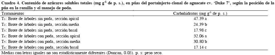 En relación a esto último, la época en que fueron extraídas las púas para la cuantificación de carbohidratos correspondió al inicio del periodo de crecimiento o 'flush' radicular en la zona de realización del ensayo (F. Hernández G., Com. personal1). La distribución del carbono dentro de la planta depende de complejas reglas que están relacionadas a los órganos exportadores o "source" que son principalmente los brotes, y los órganos demandantes o "sink" que corresponden a los frutos y raíces (Génard et al., 2008). El contenido de carbohidratos solubles totales cuantificados en púas de 'Duke 7' obtenidas en este ensayo se podría relacionar también con los estudios realizados por Castillo et al. (1996), quienes cuantificaron estos mismos azúcares en brotes e inflorescencias indeterminadas del aguacate 'Colín V33', y encontraron que el contenido de azúcares solubles totales es mayor en brotes que en inflorescencias, lo que hace suponer que los brotes por su alta actividad metabólica ejercen una mayor demanda de estos compuestos que las estructuras florales.