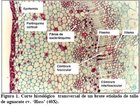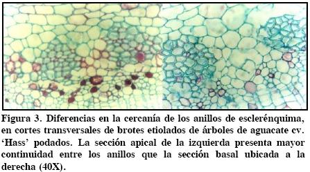 Los análisis histológicos mostraron posibles diferencias en la organización anatómica de los tejidos por efecto de la poda y de la posición de la yema dentro del brote. Los tejidos que componen el tallo de un brote etiolado de aguacate se describen en la Figura 1. Destaca la menor continuidad del anillo esclerenquimatoso en las secciones basales, con respecto a las apicales (Figuras 2 y 3), situación aún más notoria en el material procedente de árboles podados. FloresVindas (1999) describió a las fibras del esclerénquima como estructuras celulares presentes en tallos, hojas, raíces y frutos, asociadas con el tejido vascular, sobre todo con el xilema.