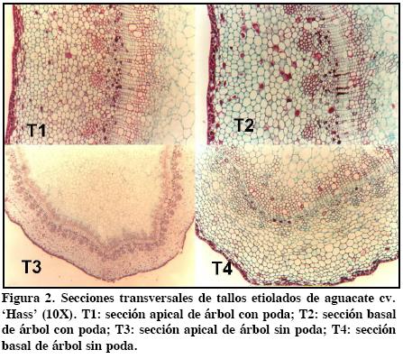 Las variables medidas fueron: 1) Días transcurridos entre la injertación y expansión de las primeras hojas de las yemas (1 a 2 cm de longitud); y 2) Diámetro del brote etiolado a 10 cm desde su base al ápice, después de seis semanas en oscuridad. El diámetro se midió con un vernier digital Mitutoyo® (código 500144, serie 0001325, Japón). Adicionalmente, se extrajeron dos trozos de brotes etiolados procedentes de injertos de las secciones apicales y basales de los árboles de 'Hass' con y sin poda. Para el análisis histológico estos trozos fueron fijados en una solución de formalina, ácido acético y alcohol (10: 5: 50, v/v) (Ruzin, 1999). Luego los trozos fueron deshidratados en una batería de alcoholes de graduación creciente de 70 % a 100 % (v/v), y luego pasados a tres baños de xilol, y finalmente se sumergieron en parafina a punto de fusión (60 °C). Se cortaron secciones entre 12 a 14 jum de grosor del tallo incluido en cera, con un micrótomo rotatorio Spencer 820® (American Optical Co., Buffalo, NY, USA). Las secciones se tiñeron con safranina 1 % y verde luz 0.2 %. Los cortes fueron observados a 10X y 40X con un microscopio óptico Leite®, modelo Laborlux K, de origen alemán, conectado a una cámara fotográfica semiautomática.