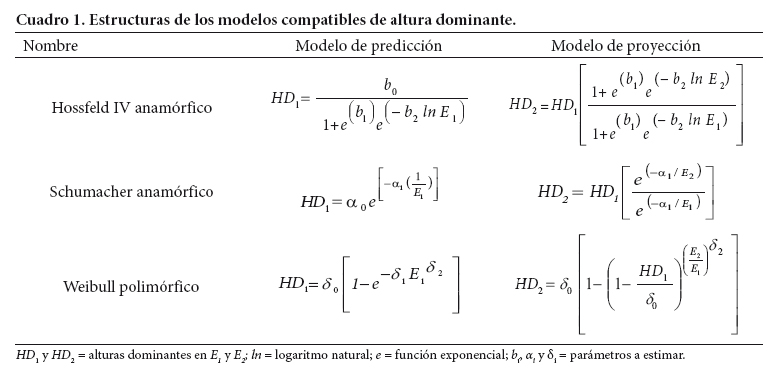En general, el modelo de diferencia algebraica que define la familia de curvas de IS tiene la forma:Y2 = f (Y1, E2, E1 , β), donde Y2 es el valor de la variable analizada del rodal a una edad E2 (edad de proyección), Y1 es la variable de interés medida a una edad E1 (edad inicial) y β es el vector de parámetros de regresión (Clutter et al., 1983; Diéguez et al., 2005; Magaña et al., 2008). Para la función f(.) se consideraron dos hipótesis de crecimiento anamórficas y una polimórfica (Cuadro 1). La hipótesis básica de las curvas anamórficas, es que las tasas relativas de crecimiento en HD entre sitios es constante pero su potencialidad máxima varía (Clutter et al., 1983). Por su parte, las curvas polimórficas se basan en la hipótesis de que la tasa relativa de crecimiento no es constante para todos los sitios. Sin embargo, la potencialidad máxima es única (Avery y Burkhart, 1983). Se debe tener en cuenta que el patrón de crecimiento en altura dominante afectará a todo el sistema, en el momento en que HD o IS se utilicen como variables independientes en cualquiera de los modelos del SCRM. Por ello, la elección de sus valores no es trivial.