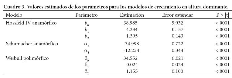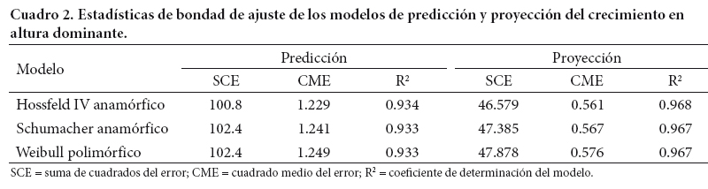 Los criterios estadísticos de bondad de ajuste y los parámetros estimados de las ecuaciones de crecimiento en altura dominante ajustadas de forma simultánea se presentan en los Cuadros 2 y 3, respectivamente. Los modelos generaron buenos ajustes, al explicar 93.3 % (predicción) y 96.8 % (proyección) de la variación total observada en la altura dominante, y se obtuvieron valores similares en los indicadores estadísticos para los modelos propuestos en la suma de cuadrados del error (SCE), cuadrado medio del error (CME) y errores estándar reducidos.
