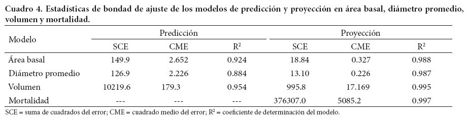 La información dasométrica de sitios permanentes de muestreo permitió aplicar el método de desarrollo de curvas de diferencia algebraica. Al ajustar de manera simultánea las ecuaciones de predicción y proyección, se logró la compatibilidad del SCRM. Al respecto, Zepeda y Domínguez (1998) y Zepeda y Acosta (2000) señalaron que el crecimiento y el rendimiento maderable deben ser modelados matemáticamente con la mayor precisión posible, por lo que debe existir compatibilidad analítica manifiesta entre las funciones de un SCRM, como ocurre en este caso.